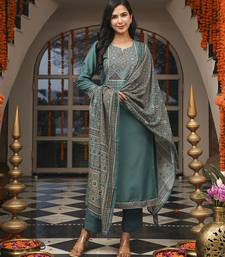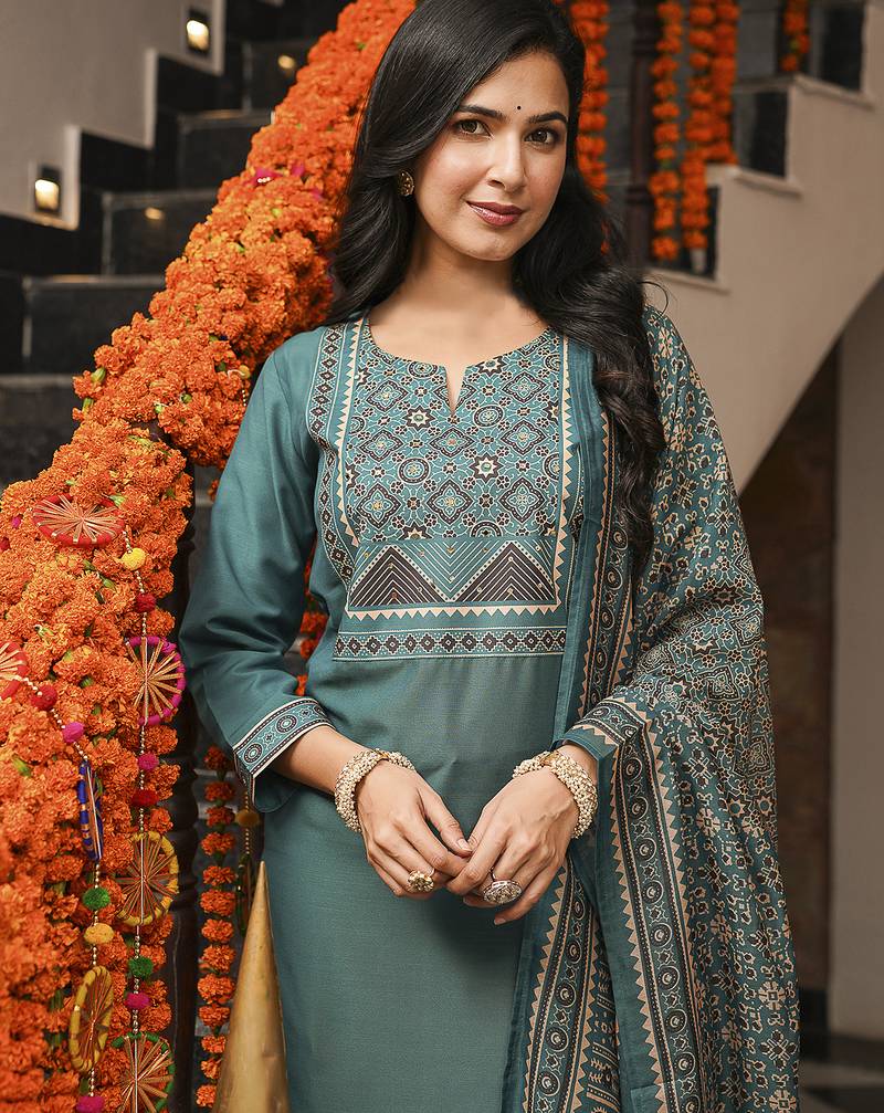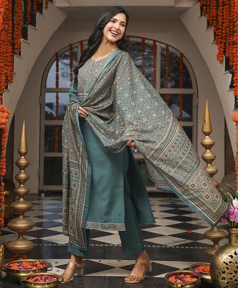 Product Name | Women Teal Rayon Blend Ajrakh Printed Straight Kurta Trousers With Dupatta | |