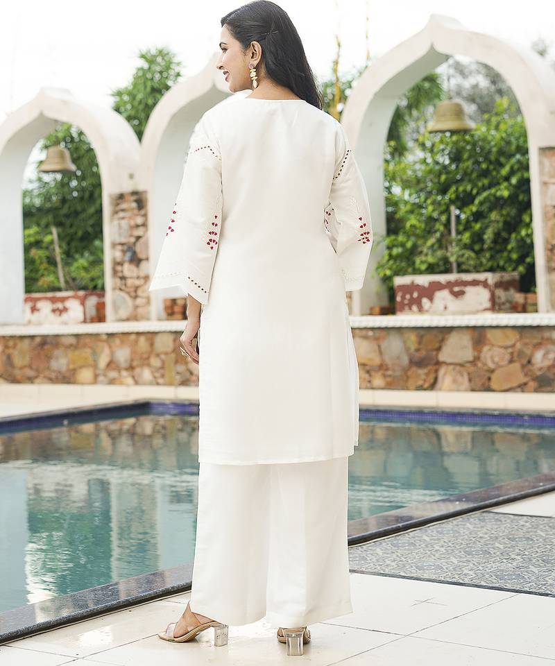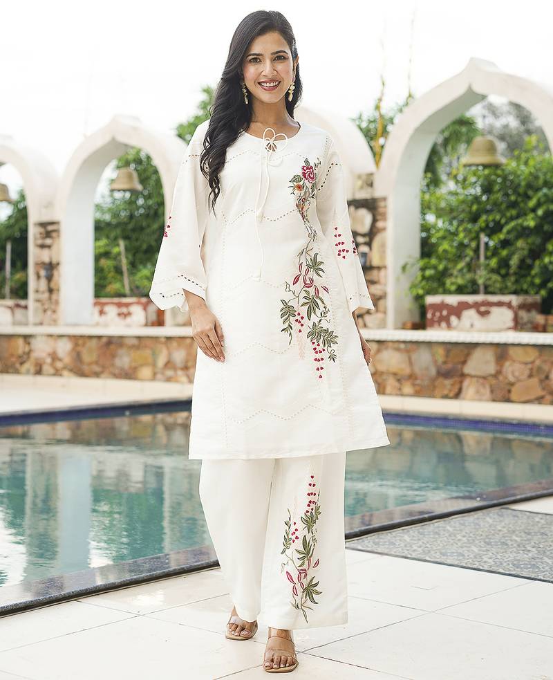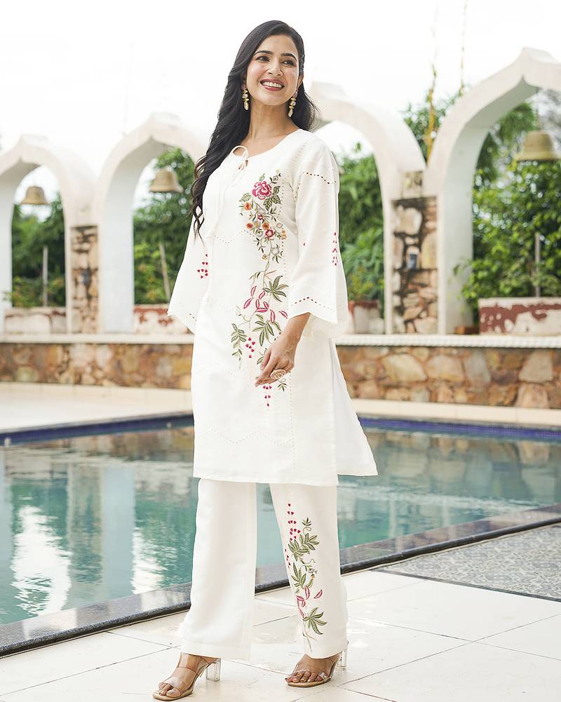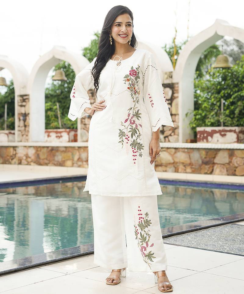 Product Name | Women White Silk Blend Solid Embroidered Coord Sets | |