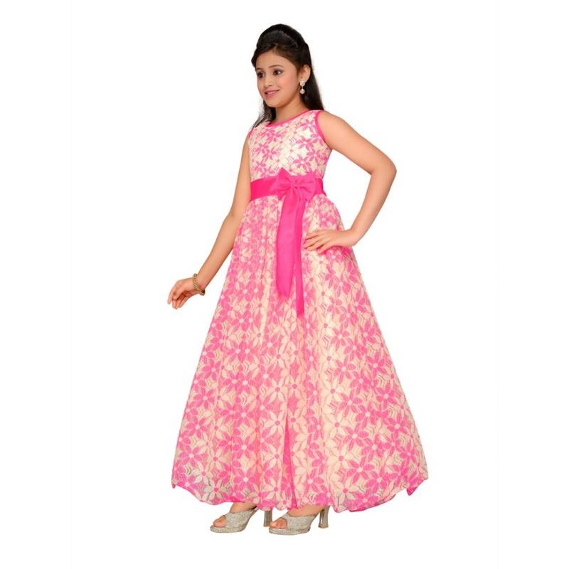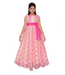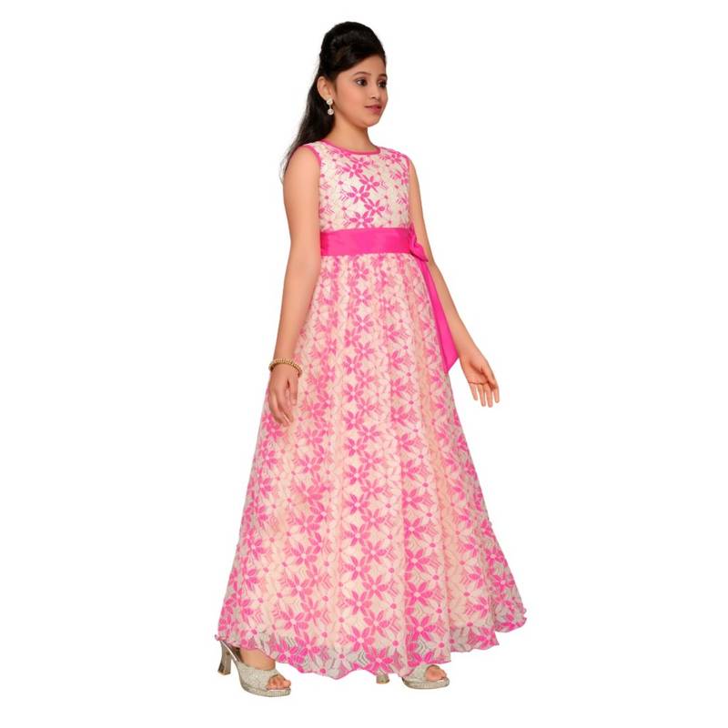 Pink printed net kids gown