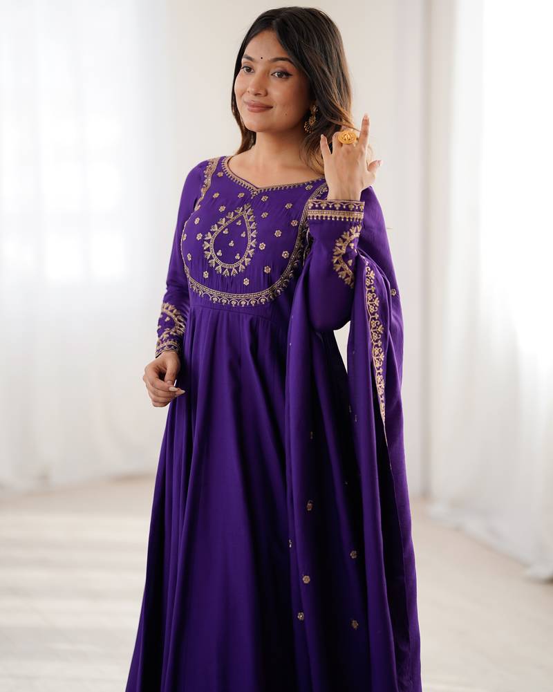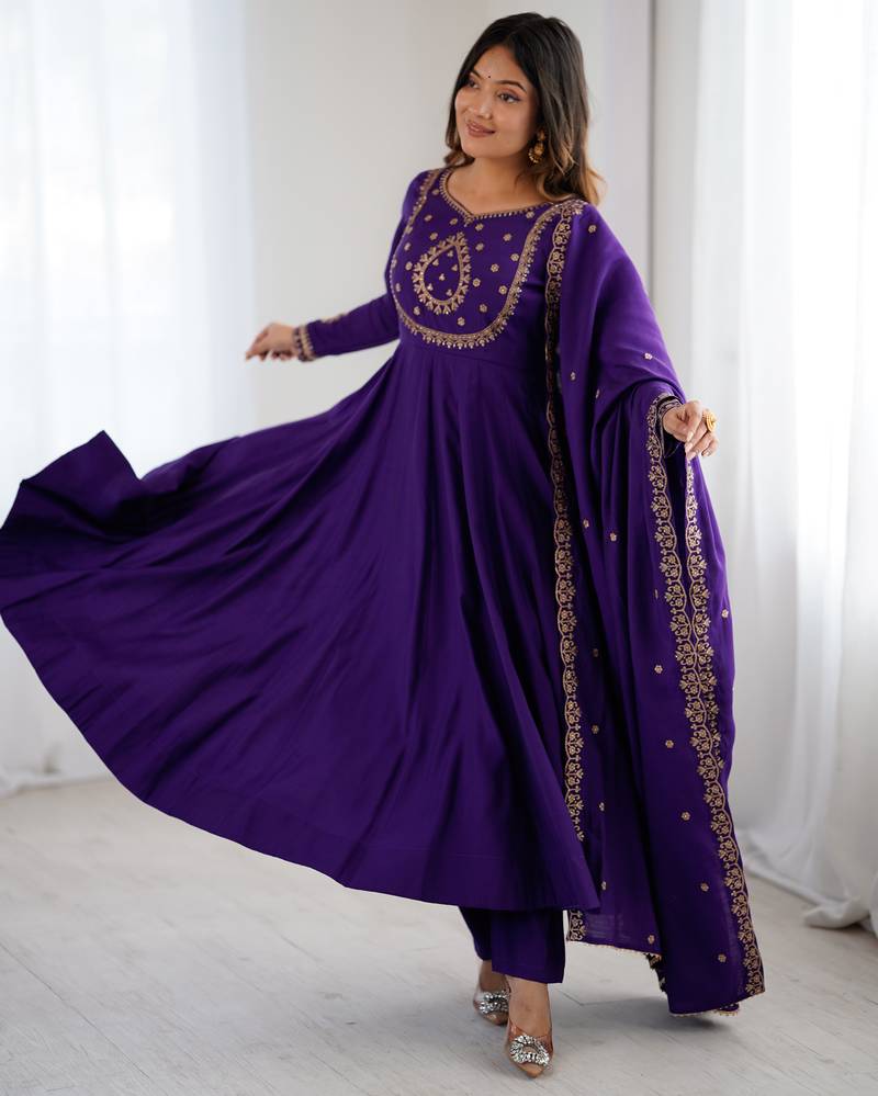 Women purple embroidered anarkali kurta set with dupatta stitched