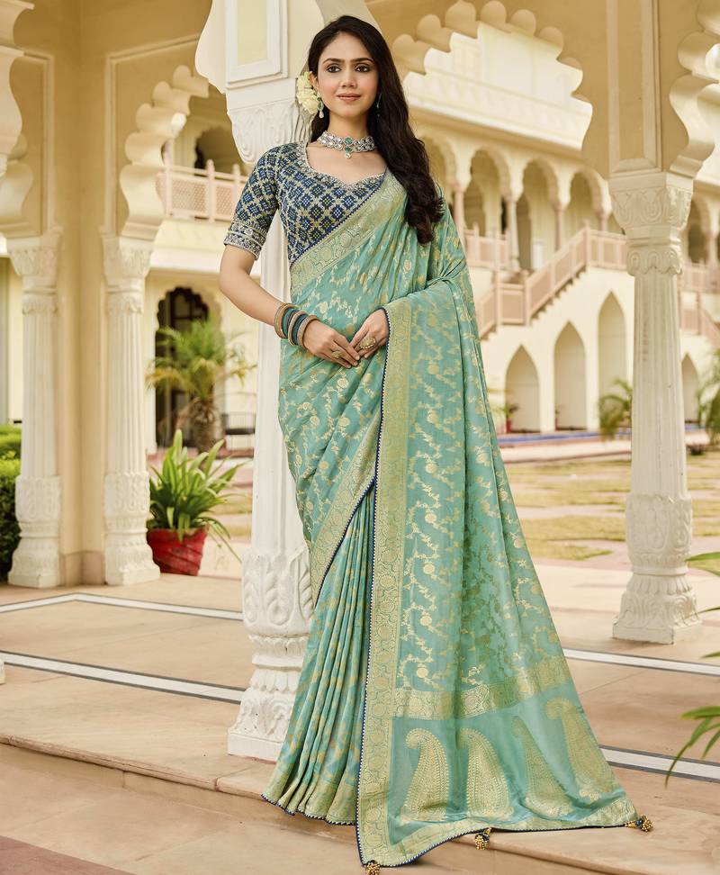 | Product Description | Add A Graceful Touch To Your Wardrobe With This Sea Green Saree, Featuring Rich Golden Weaving And A Stylish Embroidered Blouse. Ideal For Weddings, Receptions, And Festive Occasions. |