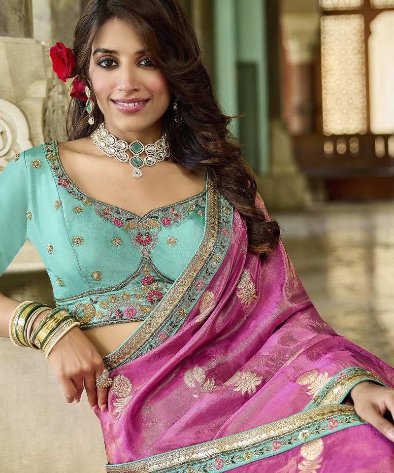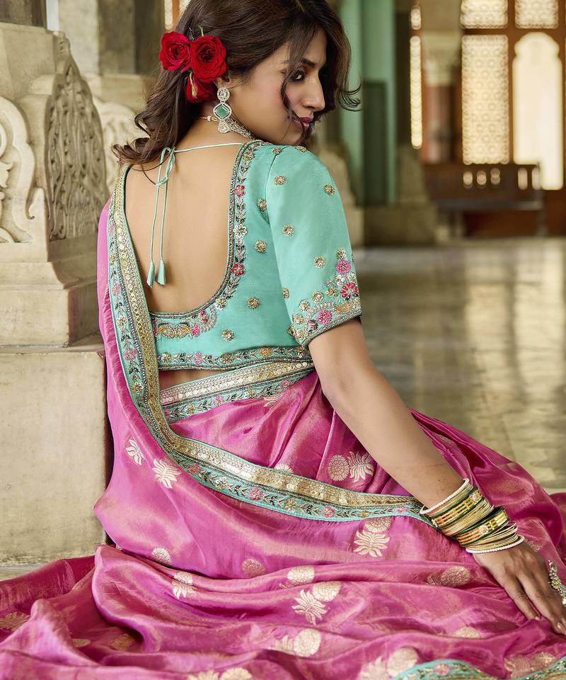 | Product Description | Royal Pink Saree With Golden Motifs And Turquoise Blouse. A Premium Designer Saree Perfect For Weddings, Receptions, Parties & Festive Celebrations. |