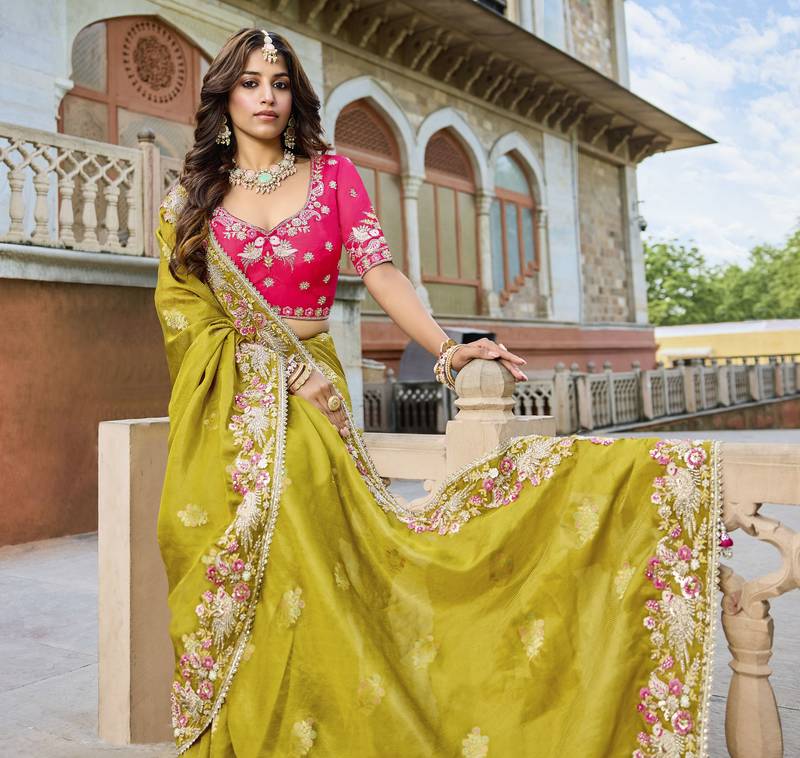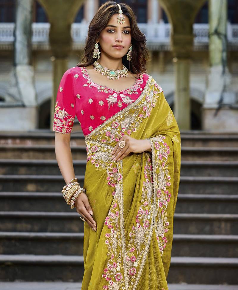 | Product Description | Elegant Mustard Yellow Saree With Floral Embroidery And Contrasting Pink Blouse. A Designer Saree Perfect For Weddings, Receptions & Festive Occasions. |