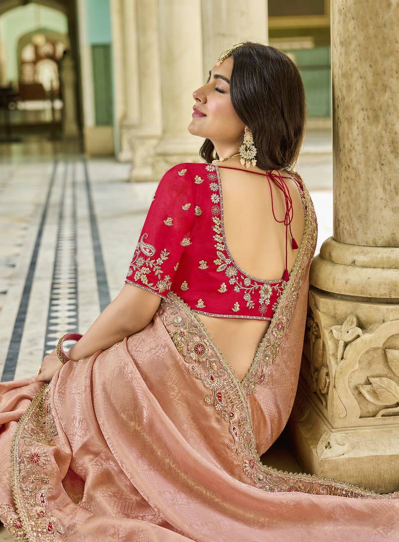 | Product Description | Experience The Elegance And Charm Of Our Peach & Red Designer Saree, Crafted For Those Who Appreciate Luxury And Tradition. This Saree Features Delicate Embroidery With A Stunning Red Contrast Blouse, Perfect For Weddings, Festive Occasions, And Parties. Every Detail Highlights The Beauty Of Artisanal Craftsmanship Combined With A Modern Aesthetic, Making It An Ideal Choice For Your Ethnic Wardrobe. This Designer Saree India Represents The Finest Blend Of Style And Cultural Heritage. |