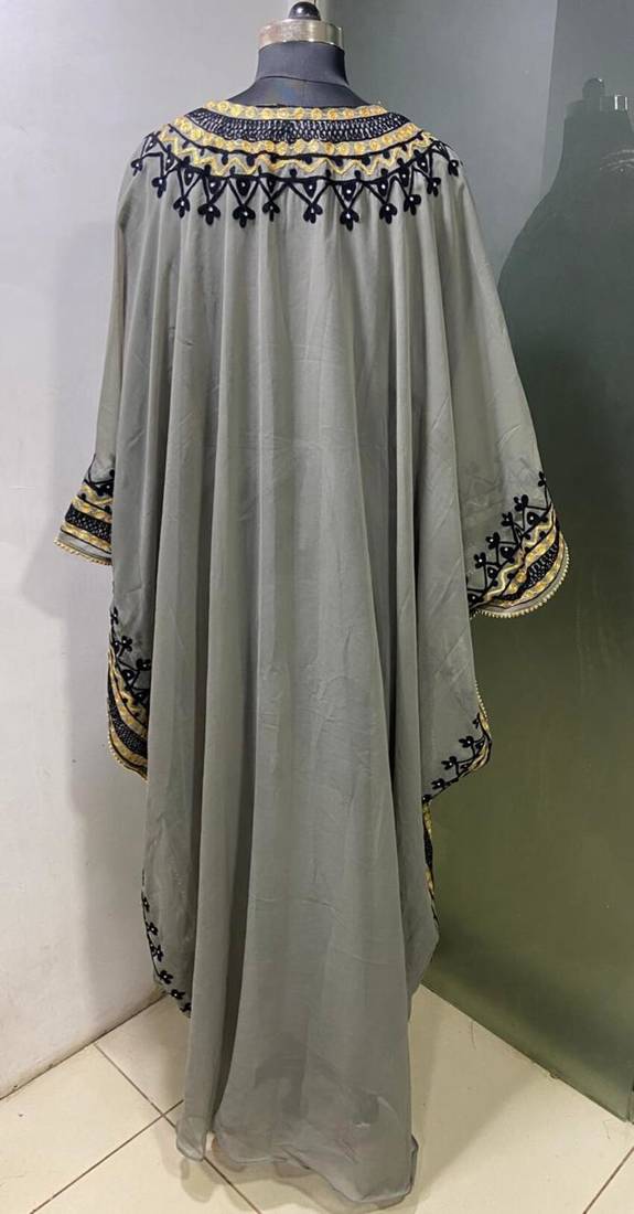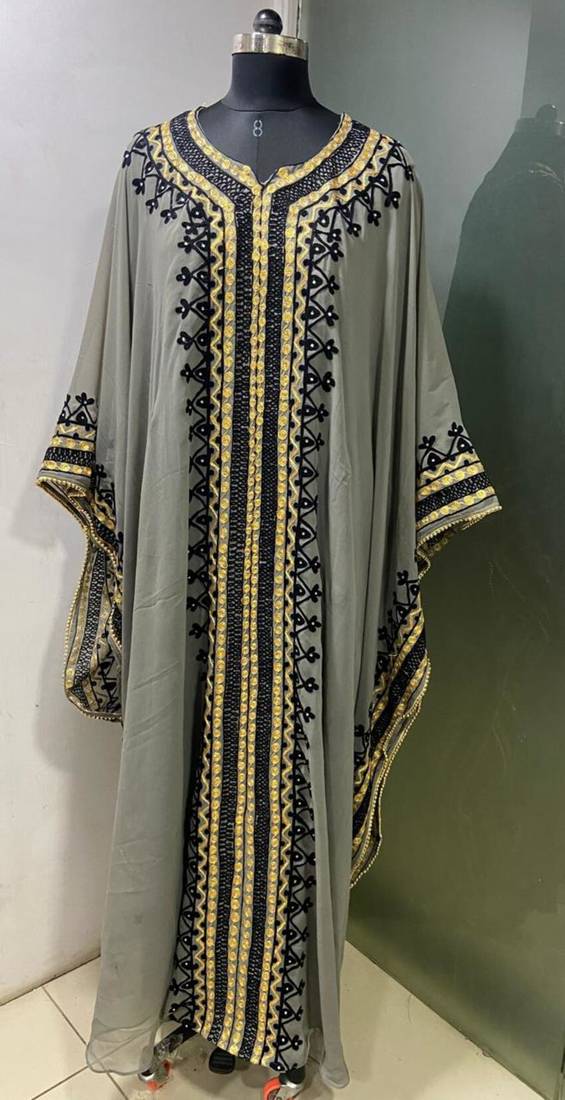 | Product Name | Grey Arabic Gold And White Embroidery Work Jalabiya Kaftan | |