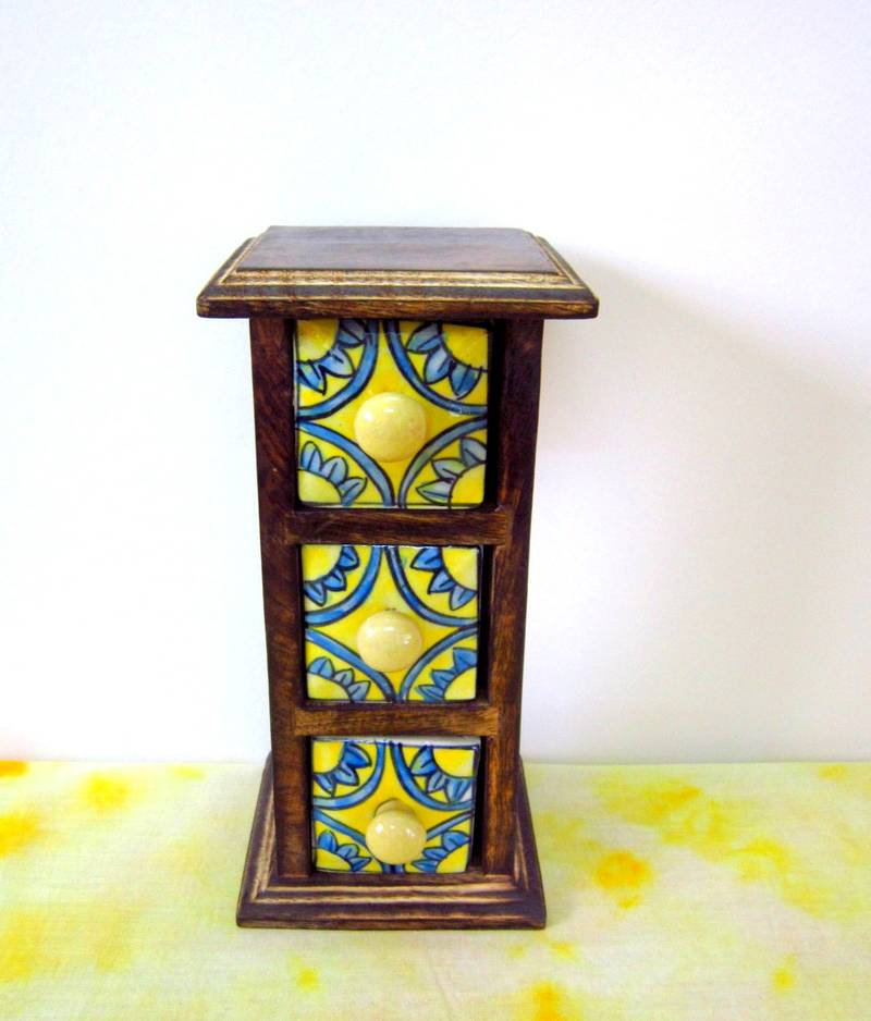 Product Description | Handcrafted Mango Wood Almirah With 3 Ceramic Drawers The Ceramic Drawers Are Handpainted The Floral Designs With Bright, Summer Colours Make A Stunning Storage Space For Your Jewellry, Spices, Sweets, Keys Or Condiments Perfect For Gifting As Well |
