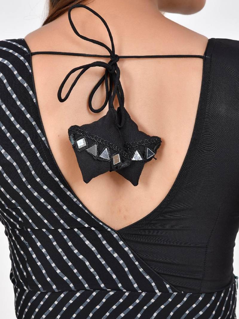 | Product Description | Black & White Lehriya Printed With Embroidered Blouse Has A V Neck, Sleeveless, And Hook And Eye Closure With Tie Up. |