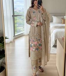 Beige chinon readymade suit with embroidery & diamond work stitched