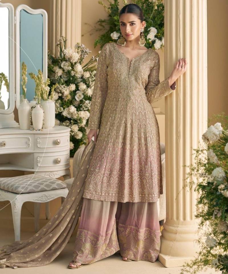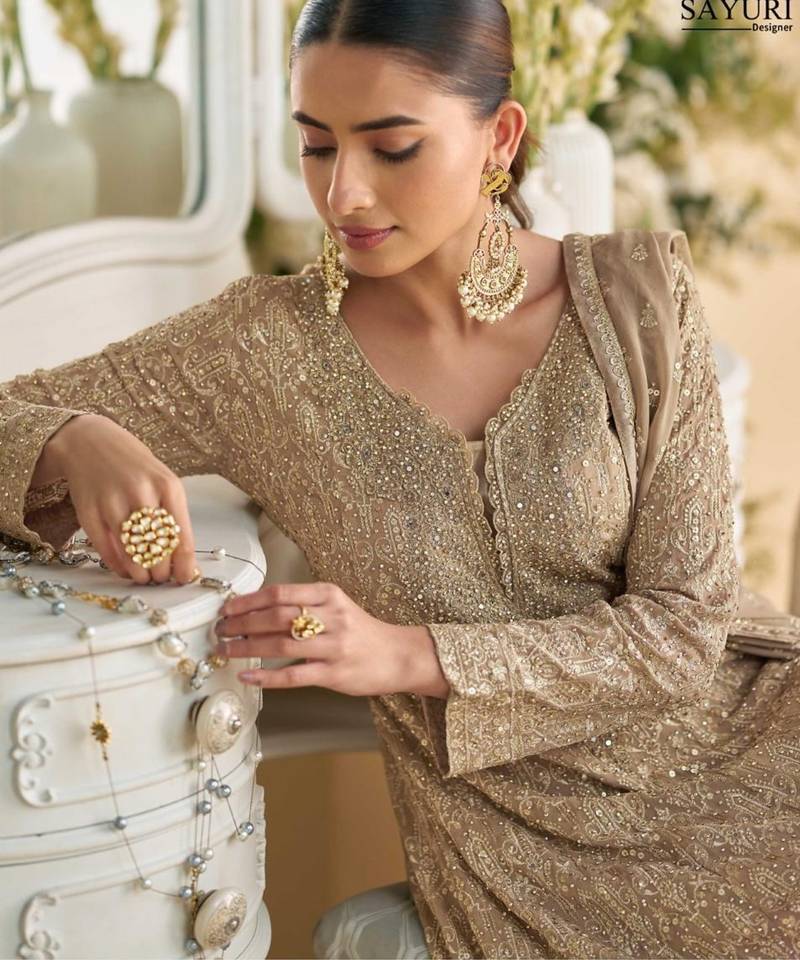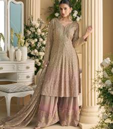 Beige heavy georgette suit stitched