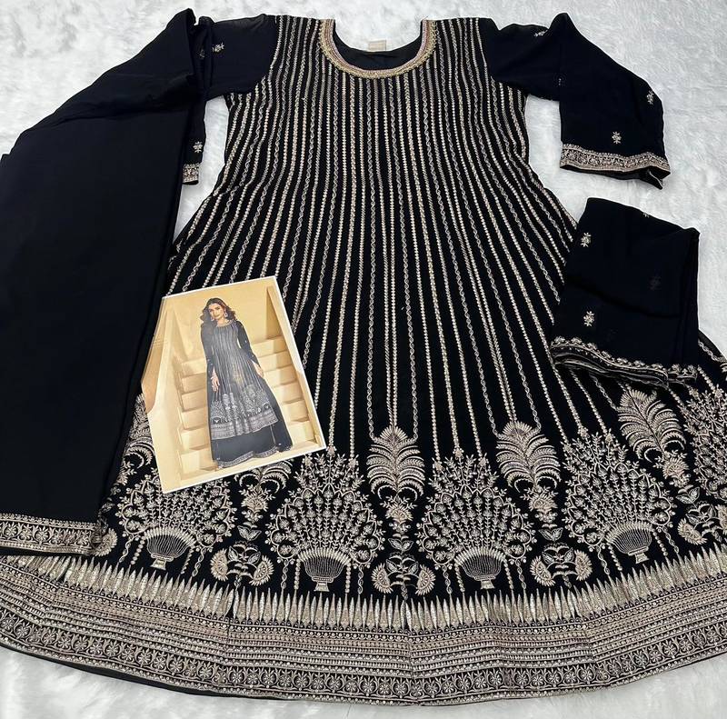 | Product Name | Black Georgette Free Size Stitched Suit With Embroidery & Sequence Work | |