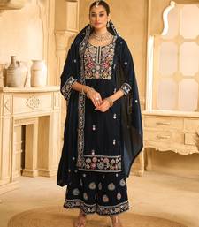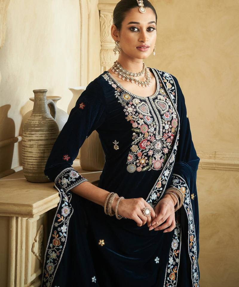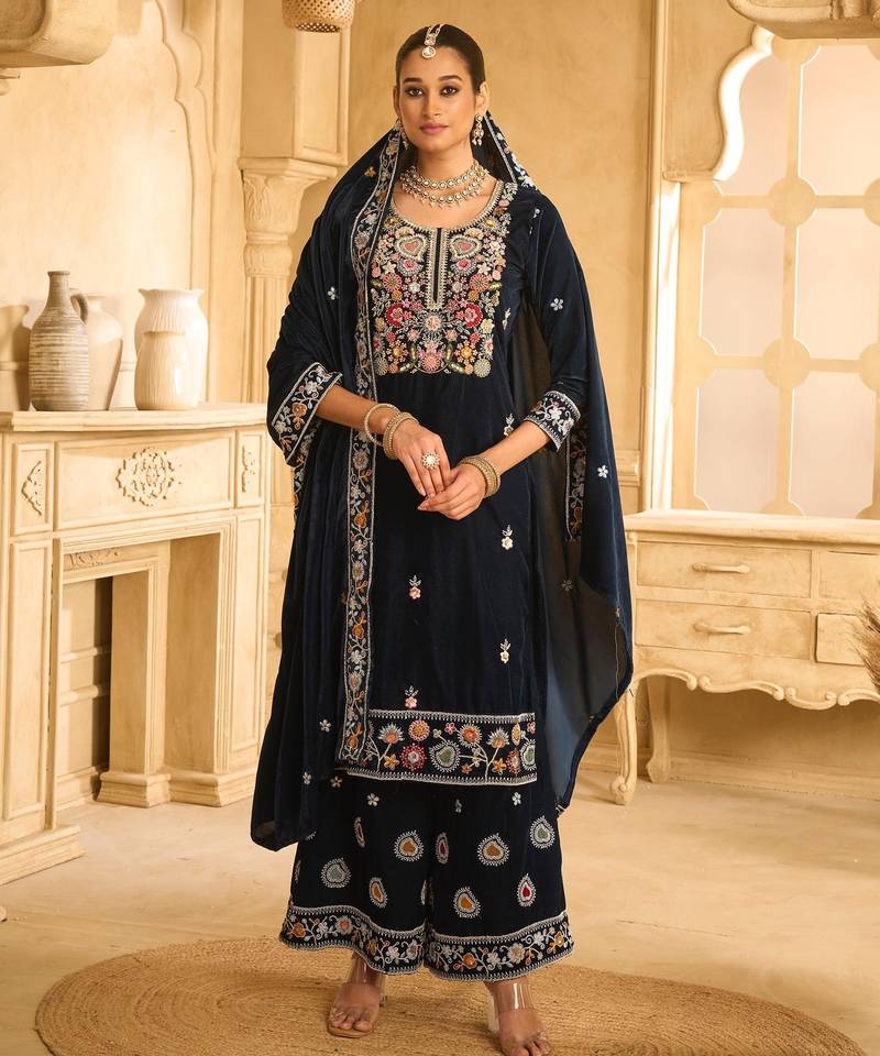 Dark blue embroderied velvet semi-stitched plazo suit semi stitched
