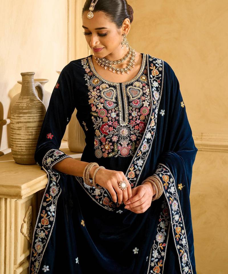 Product Name | Dark Blue Embroderied Velvet Semi Stitched Plazo Suit | |