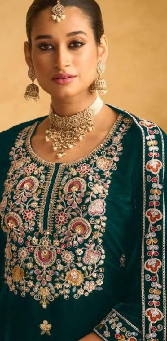 Dark green embroderied with beads velvet palazzo suit semi stitched