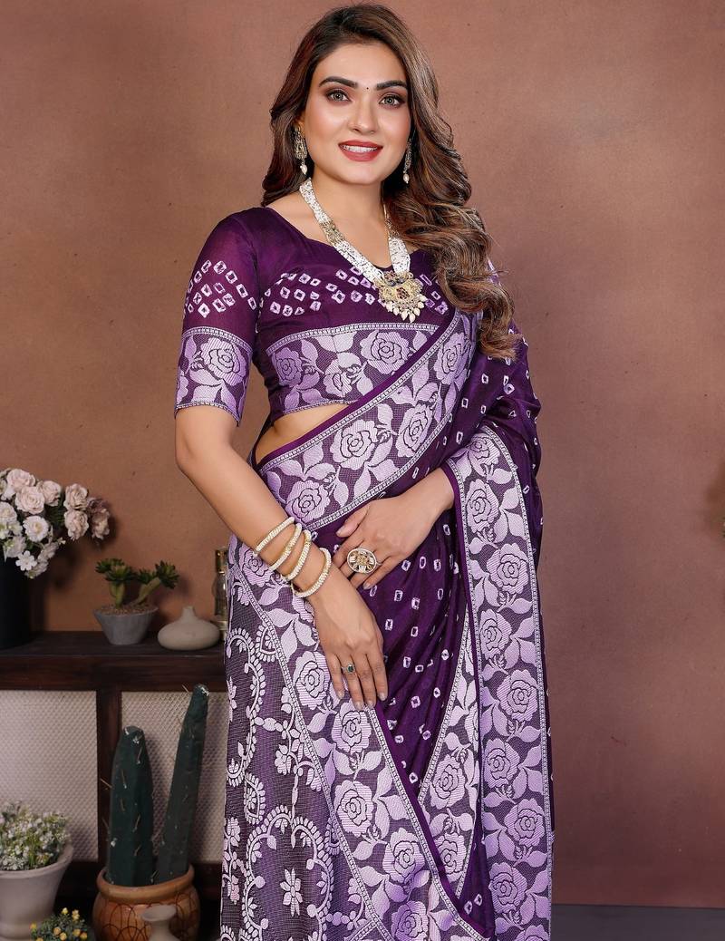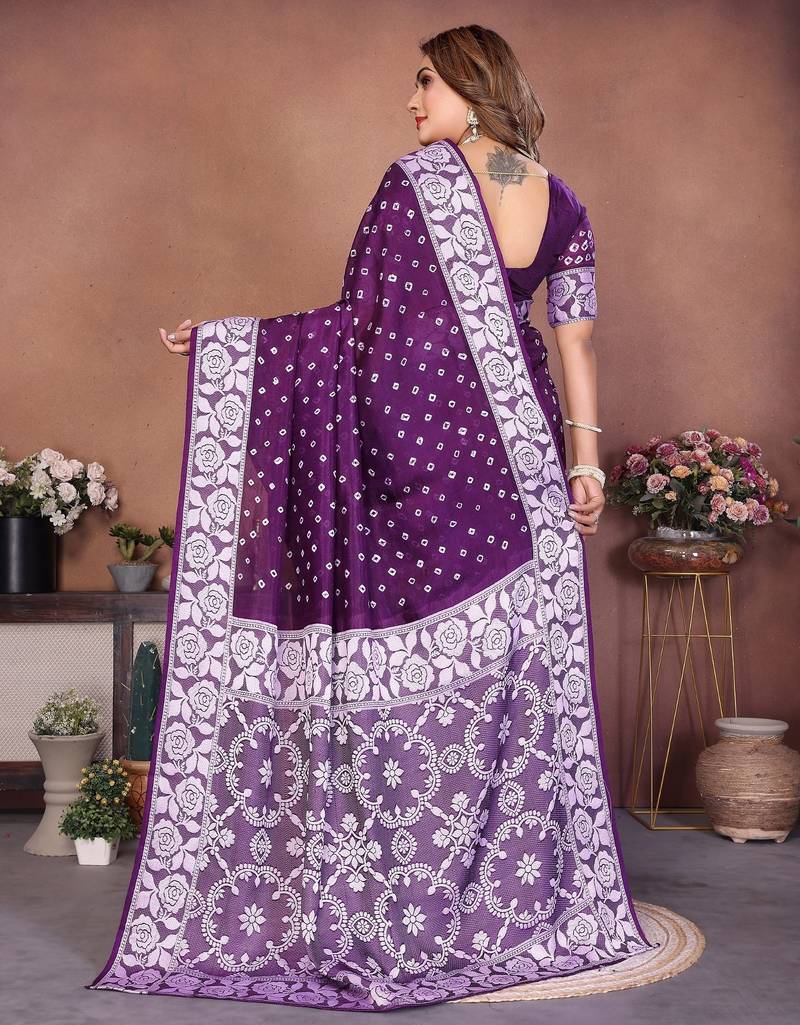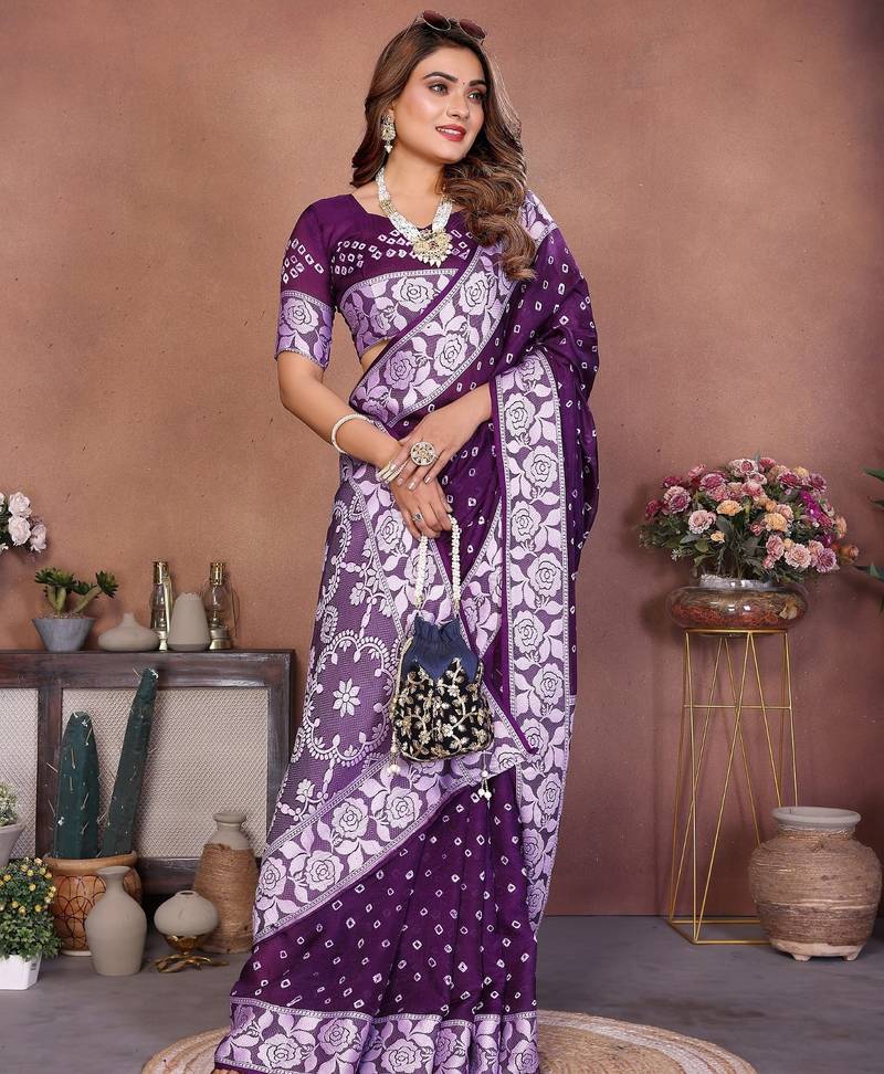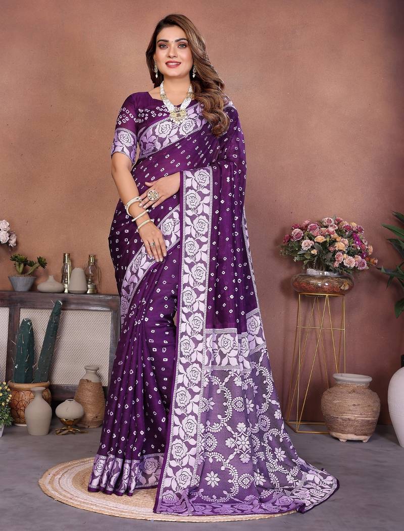 | Product Name | Dark Purple Handmade Bhandhej Viscos Silk Blend Saree With Blouse | |