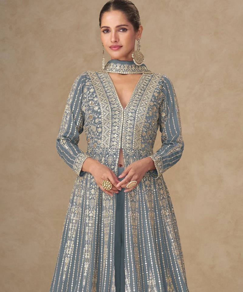 Grey chinon anarkali suits with embroidery & sequin work - full stitched free size