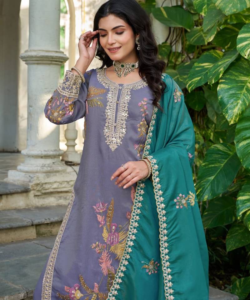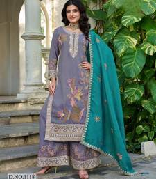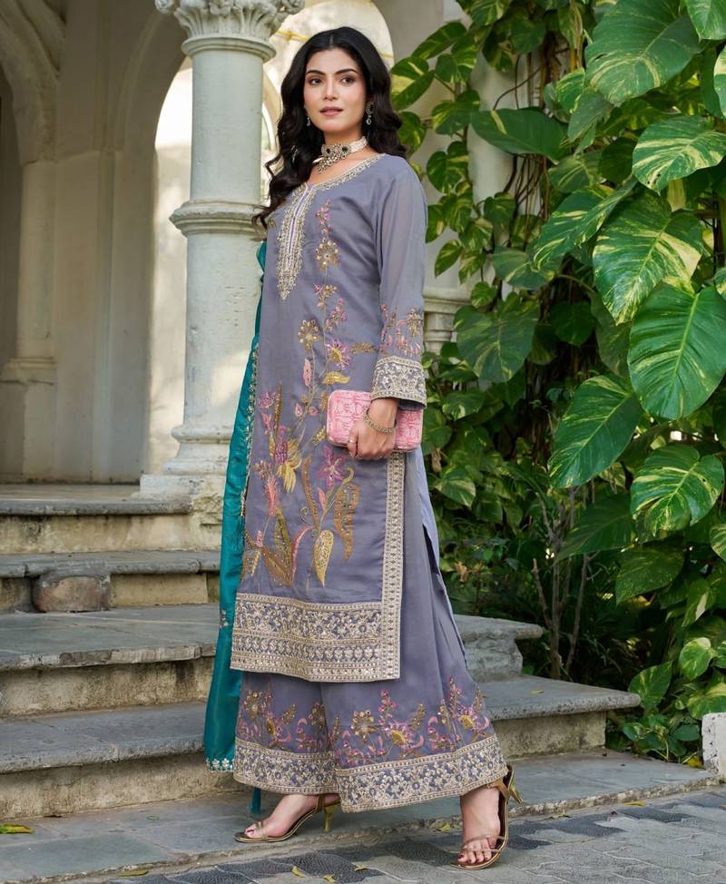 Grey shimmer free size stitched plazzo suit with codding dori & sequence work