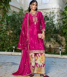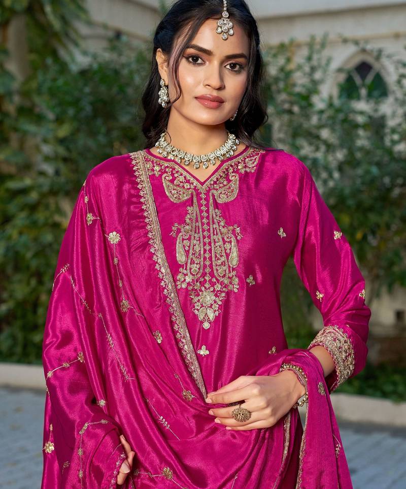 Hot pink chinon free size stitched plazzo suit with codding dori & sequence work