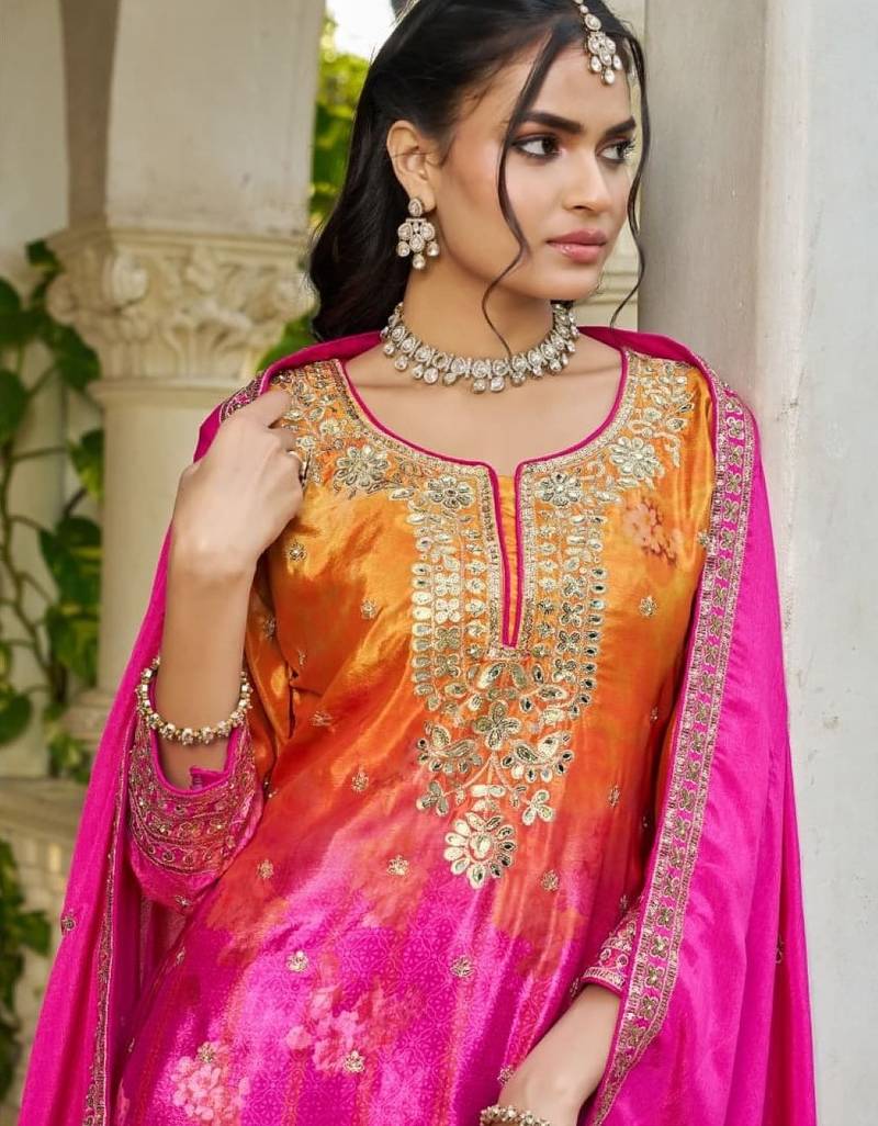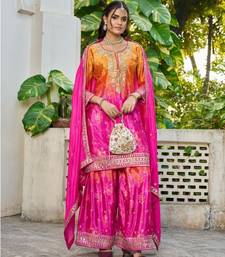 Hot pink chinon free size stitched plazzo suit with digital printed & hand work