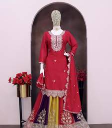 Magenta heavy chinon free size stitched suit with embroidery & sequence work