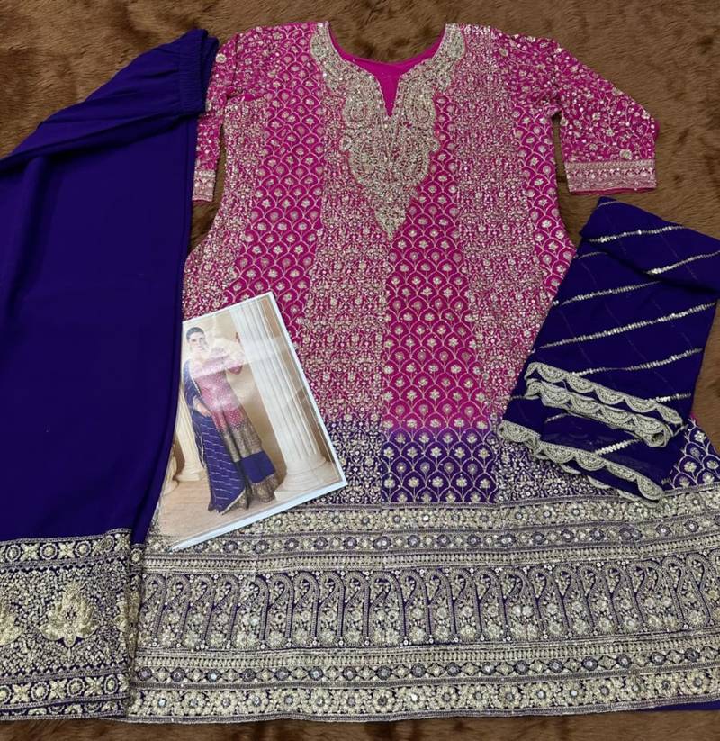 | Product Name | Magenta Real Georgette Free Size Stitched Suit With Sequence & Diamond Work | |