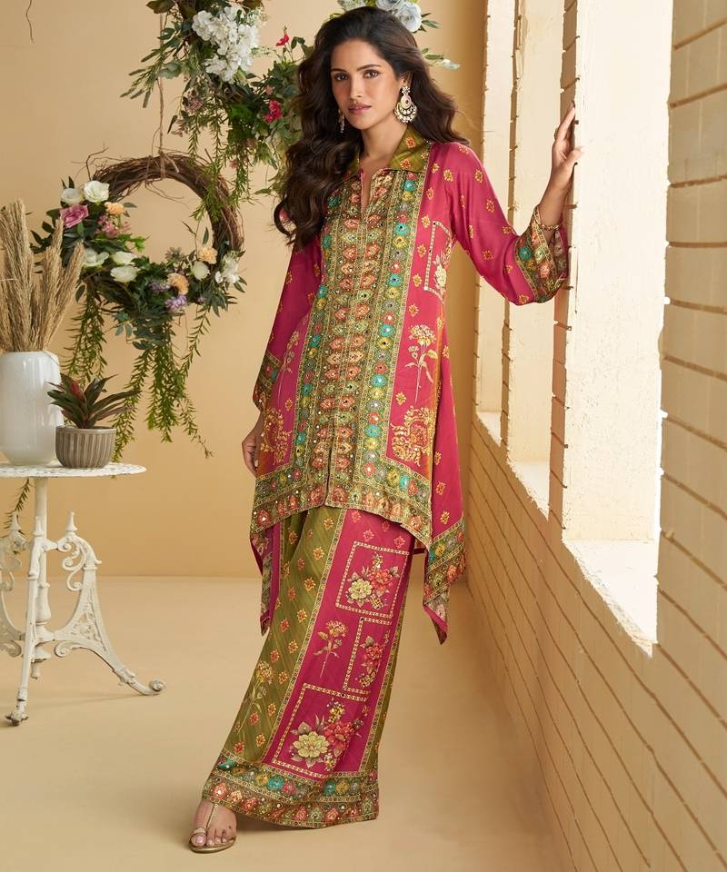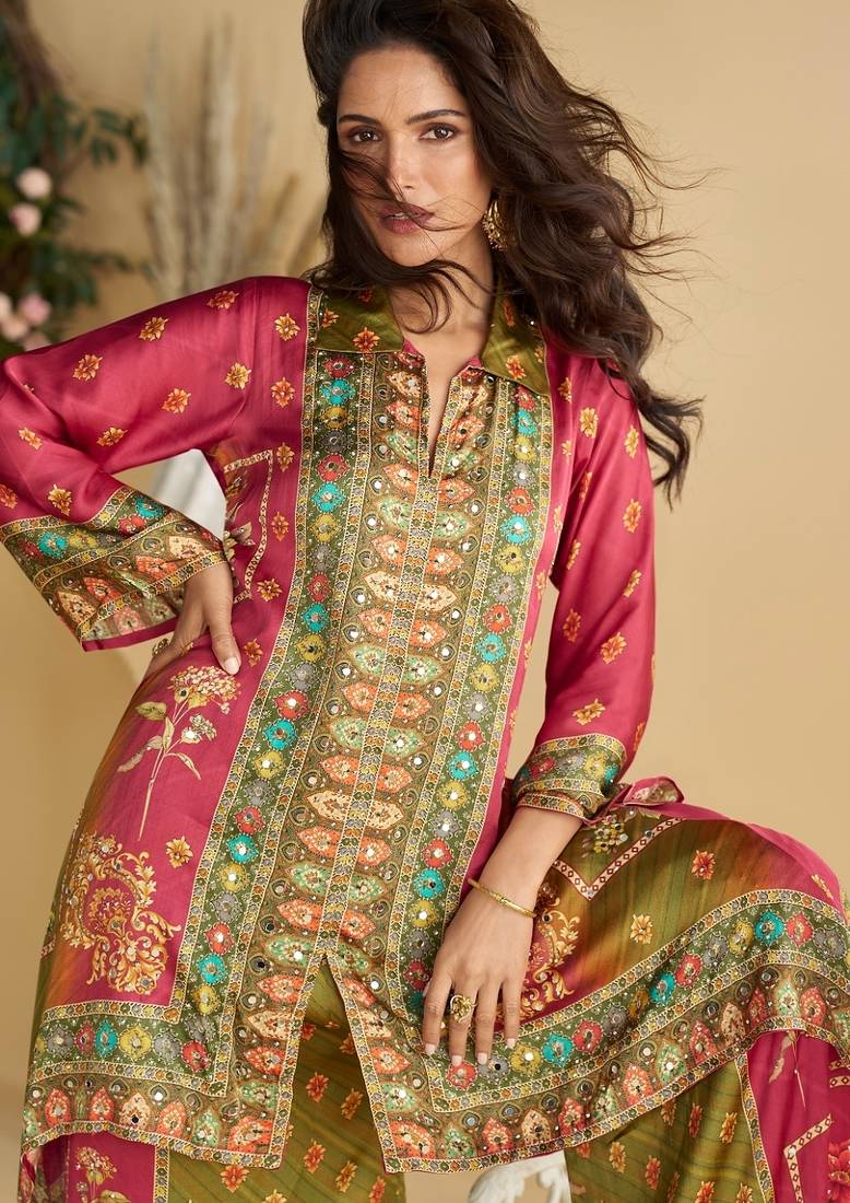 Product Name | Magenta Real Premium Digital Crep Silk Readymade Cord Set With Mirror Work | |