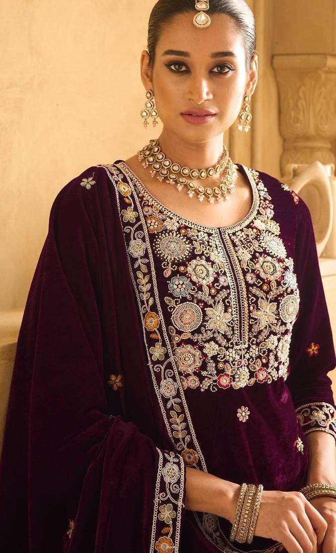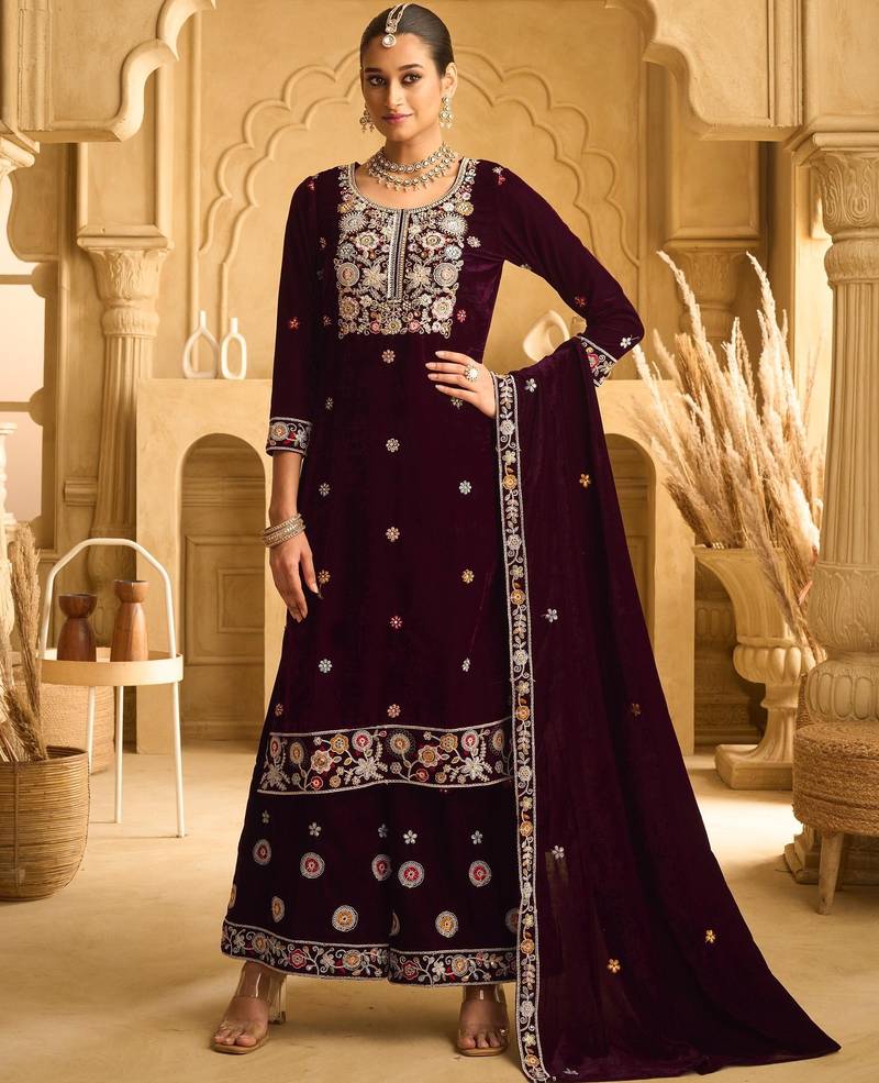 Product Name | Maroon Embroderied Work Velvet Palazzo Suit | |