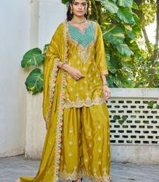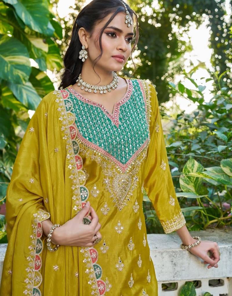 | Product Name | Mustard Chinon Free Size Stitched Plazzo Suit With Dhaga & Sequence Work | |