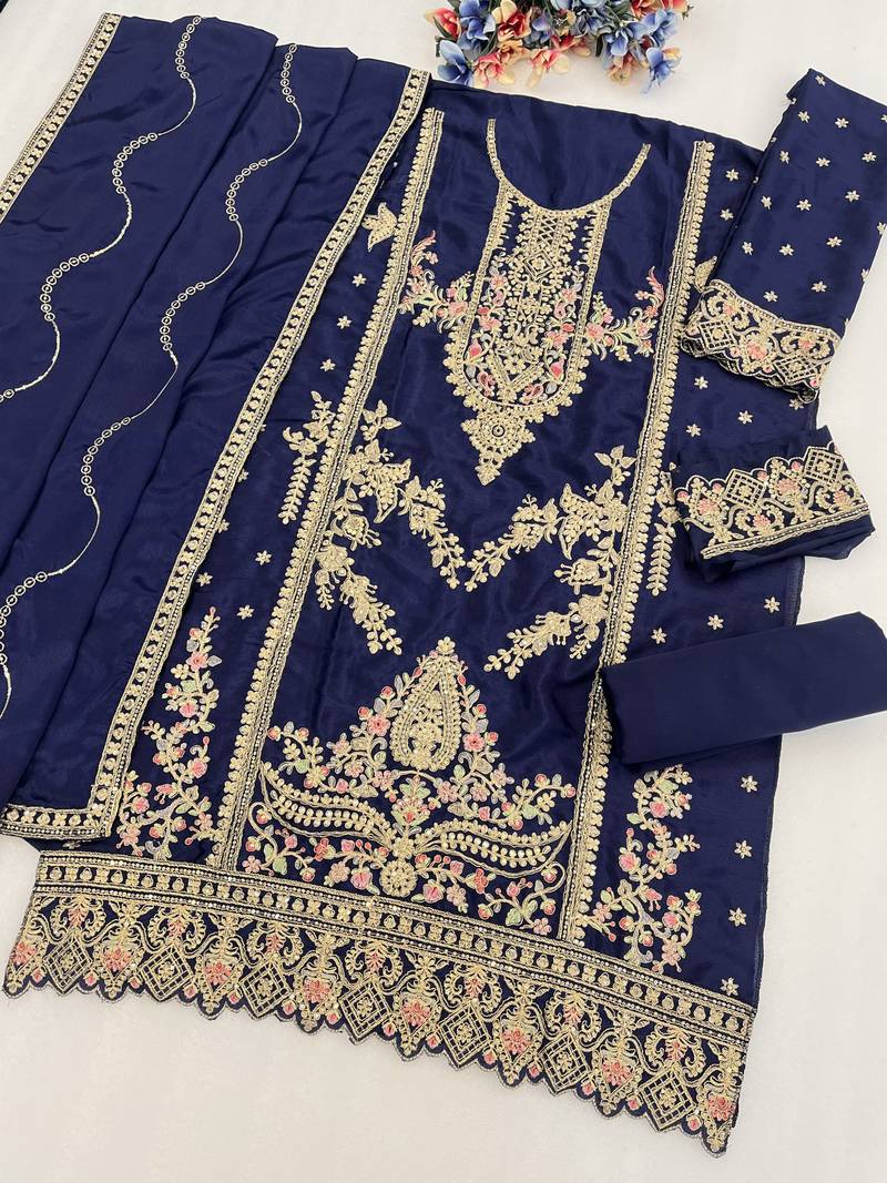 Navy blue chinon semi stitched plazzo suit with codding dori & sequence work