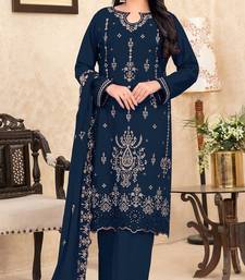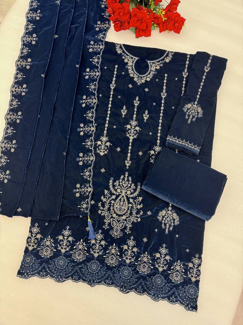 Navy blue velvet embroidered sequin suit semi stitched