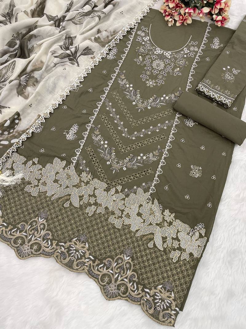 Olive embroderied cotton salwar suit semi stitched