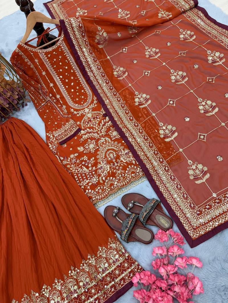 | Product Name | Orange Faux Georgette Readymade Suit With Embroidery & Moti Work | |