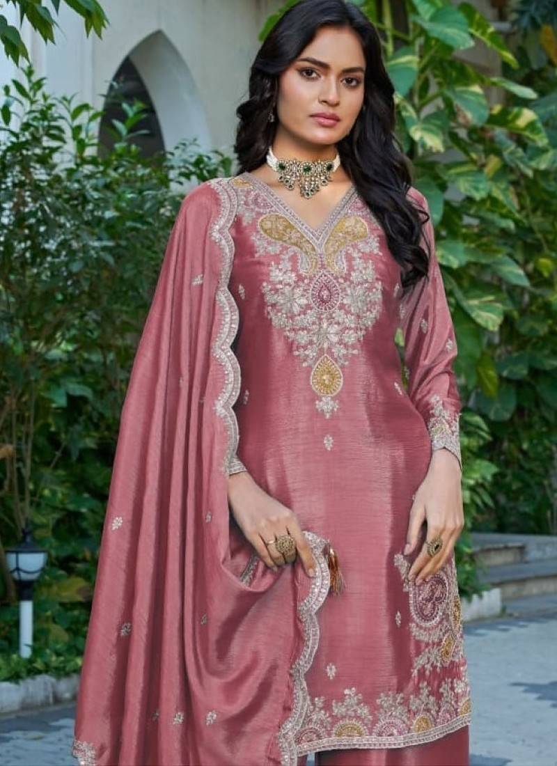 | Product Name | Peach Chinon Free Size Stitched Plazzo Suit With Dhaga & Sequence Work | |