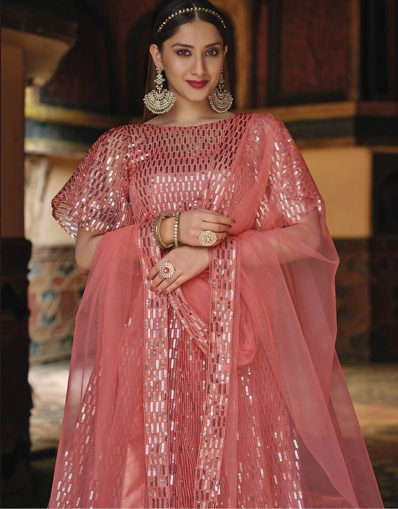 Peach net partywear lehenga choli set with embroidery & sequin work