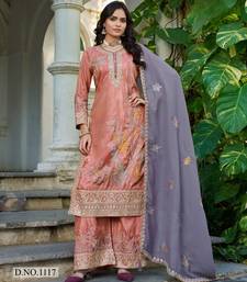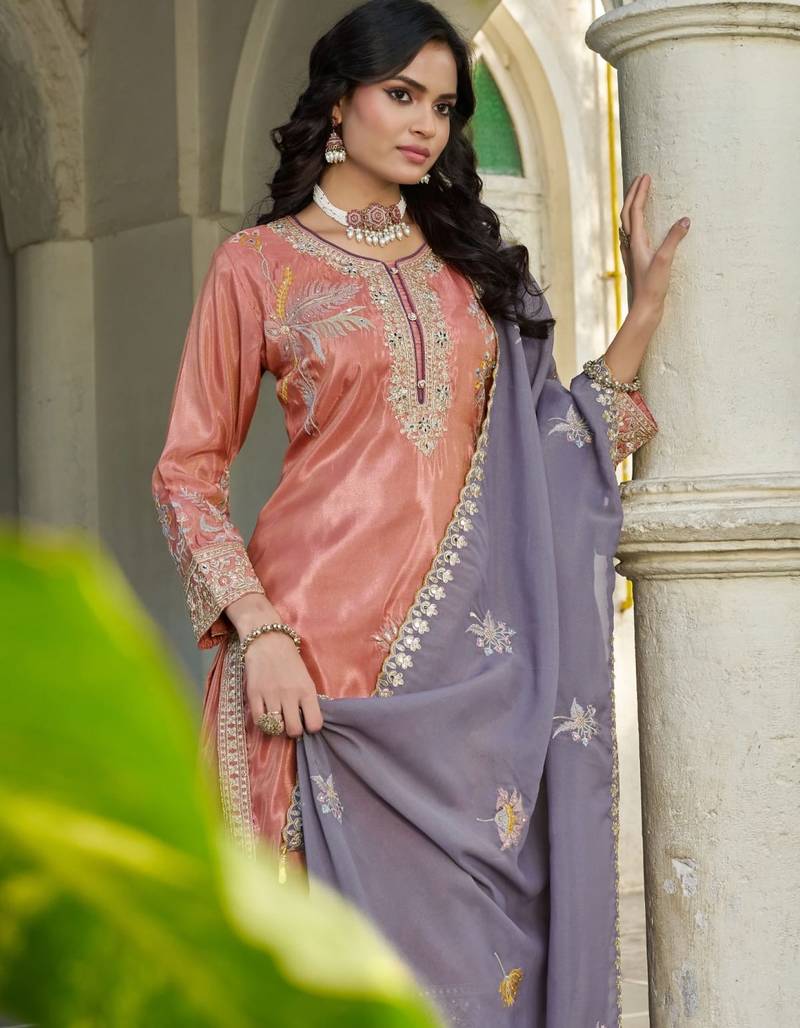 Peach shimmer free size stitched plazzo suit with codding dori & sequence work