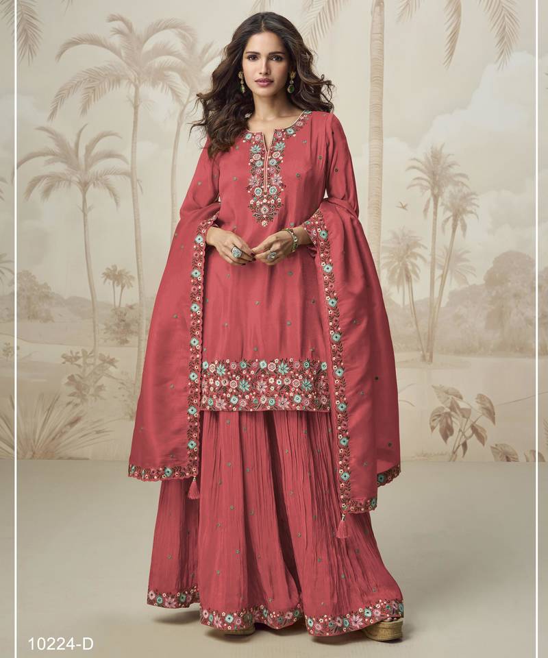 Peach simar with embroidery multi & zarkhan work palazzo suit stitched