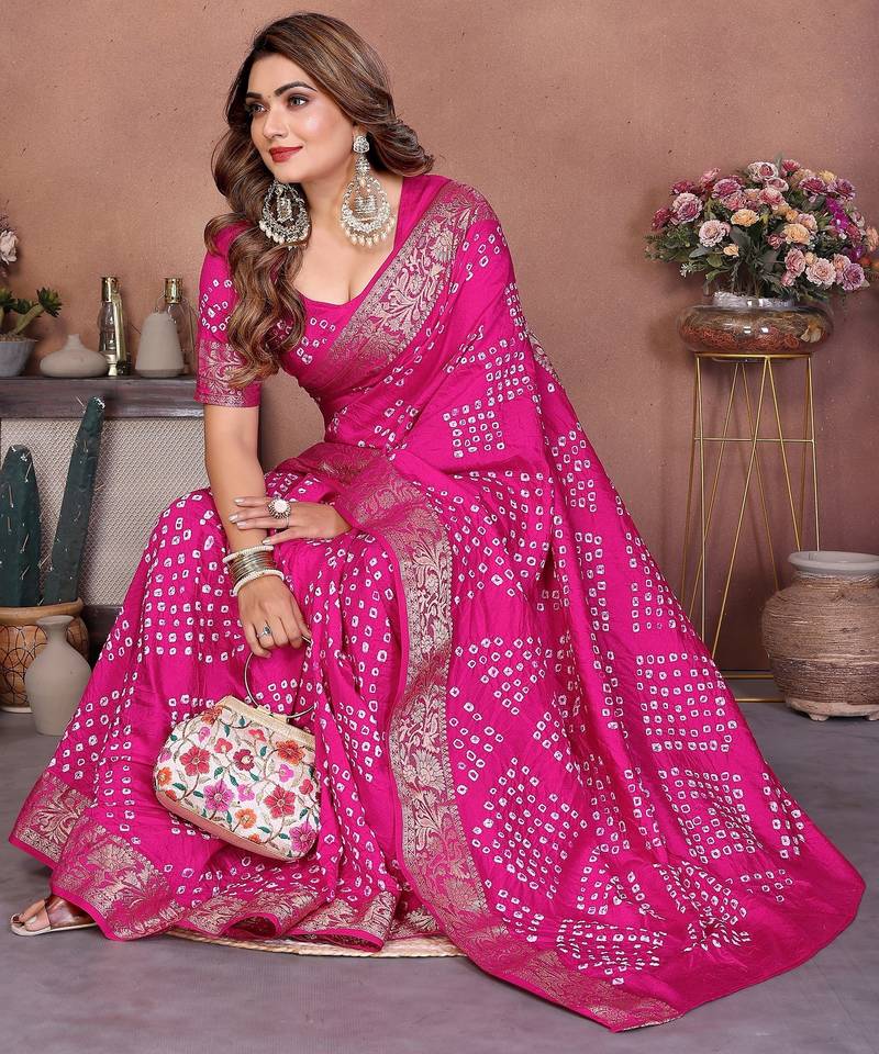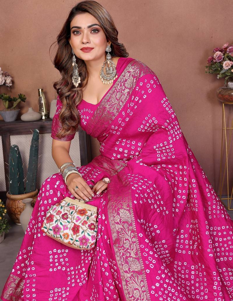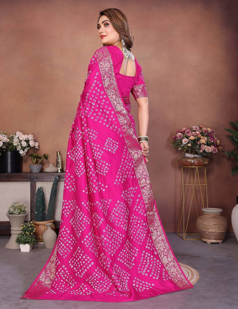 | Product Name | Pink Handmade Bhandhej Viscos Silk Blend Saree With Blouse | |