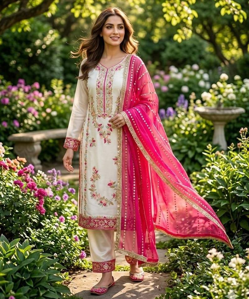 | Product Name | Pink & White Gimmy Chu Readymade Suit With Embroidery & Moti Work | |