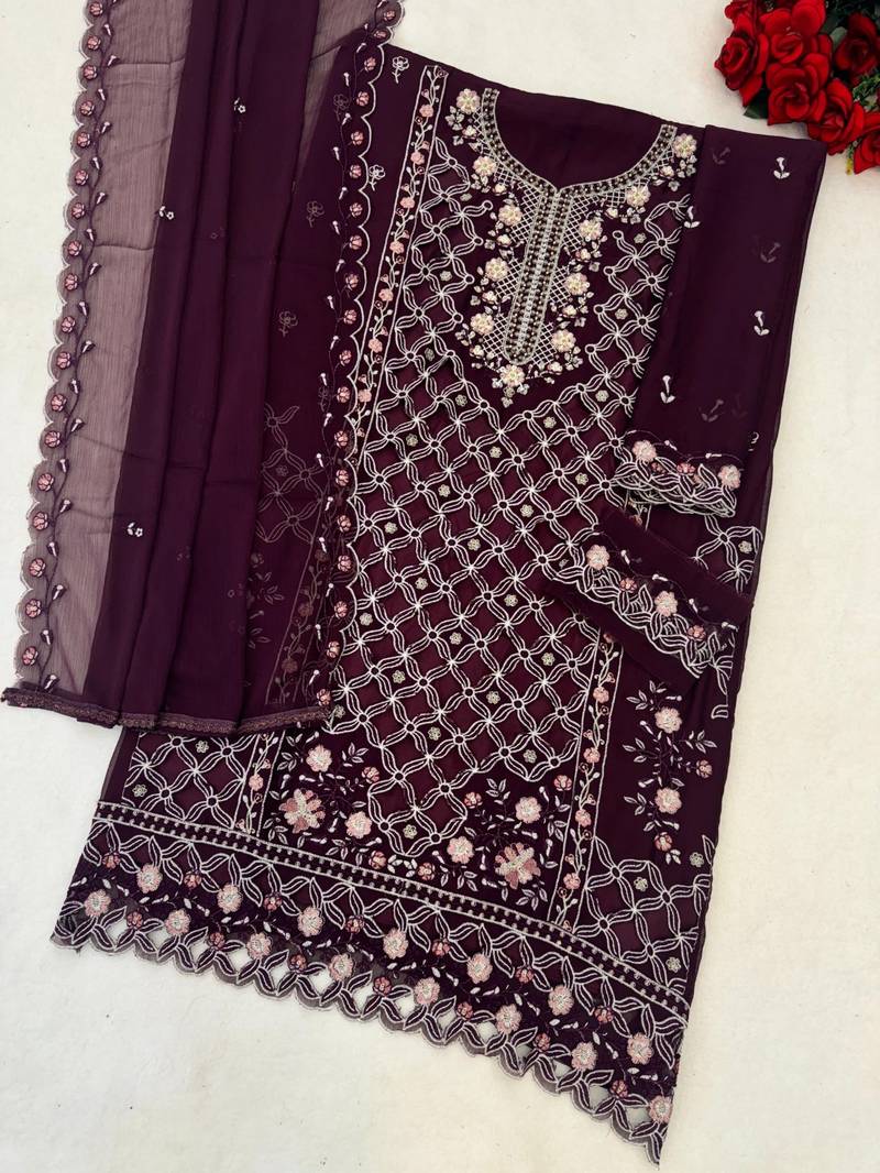 Purple chiffon embroidered sequin suit semi stitched