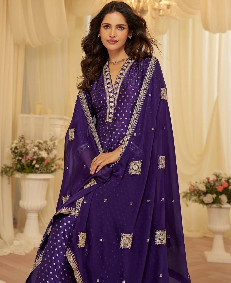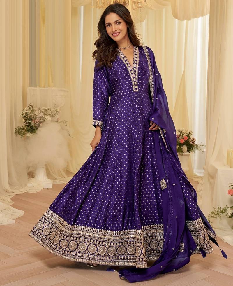 | Product Name | Purple Chinon Free Size Stitched Jacquard Anarkali Suit With Codding Dori & Sequence Work | |