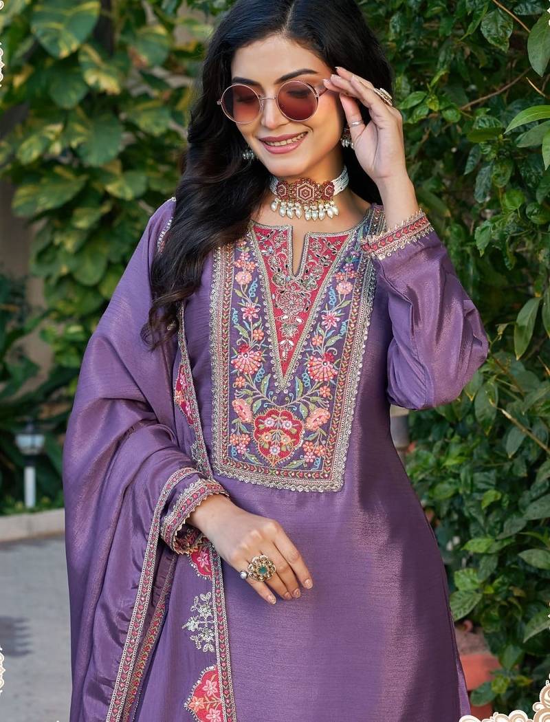 | Product Name | Purple Chinon Free Size Stitched Plazzo Suit With Codding Dori & Sequence Work | |
