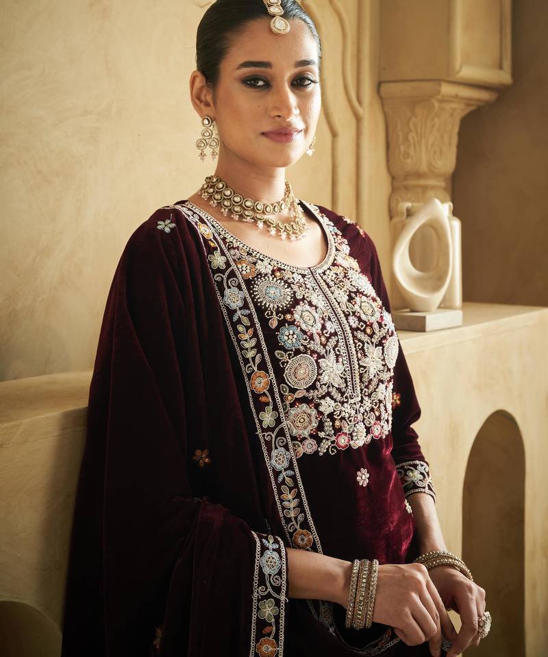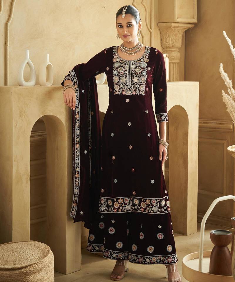 Product Name | Purple Embroderied Work Velvet Semi Stitched Plazo Suit | |