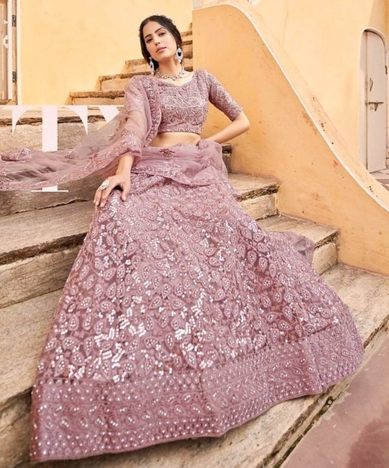 Purple net wedding wear lehenga choli set with embroidery & sequin work