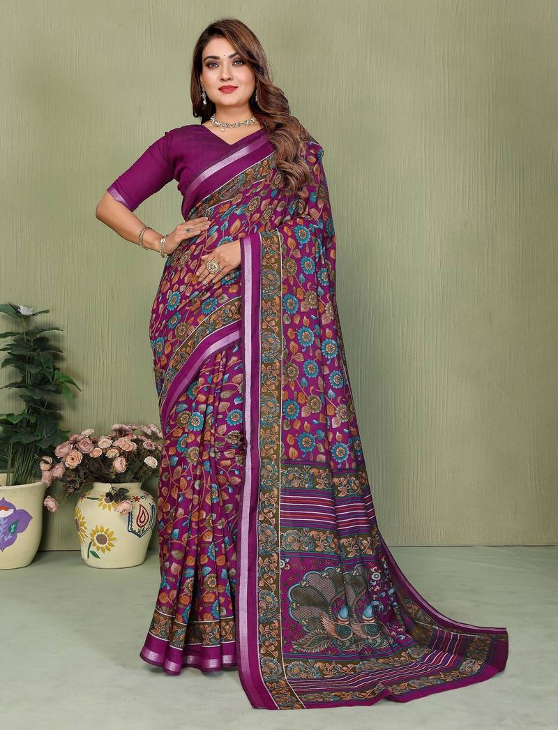 | Product Name | Purple Printed Mal Cotton Saree With Blouse | |