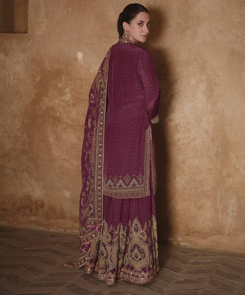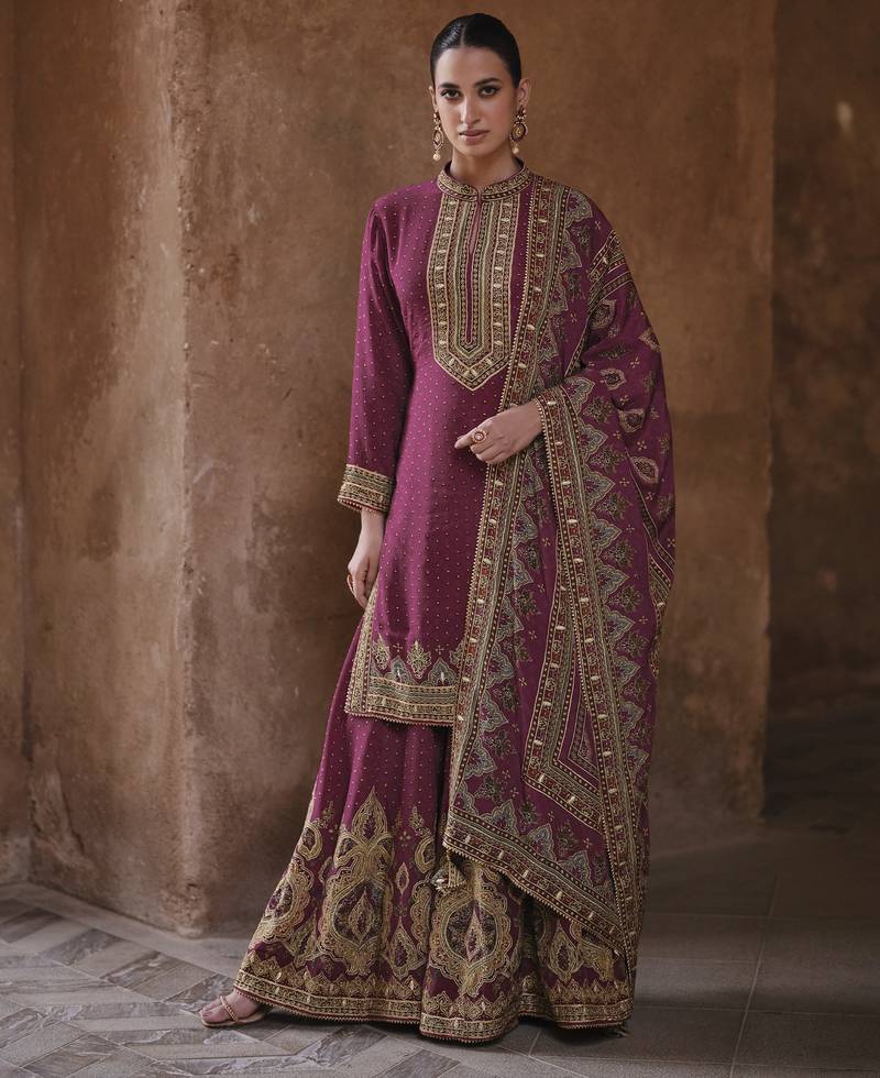 Purple silk embroidered sharara suit stitched