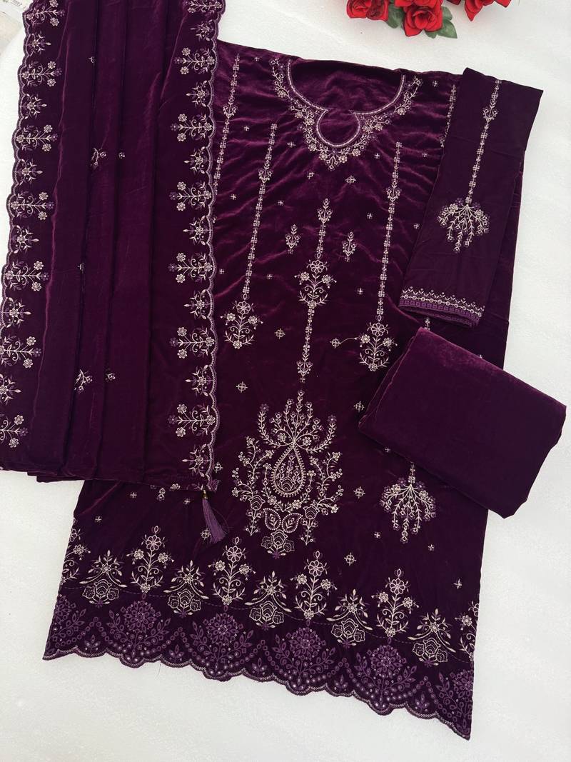 Purple velvet embroidered sequin suit semi stitched