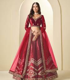 Red ice velvelt semi stitched lehenga choli witn embroidery work