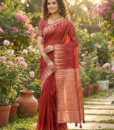 Red linen woven work saree with blouse