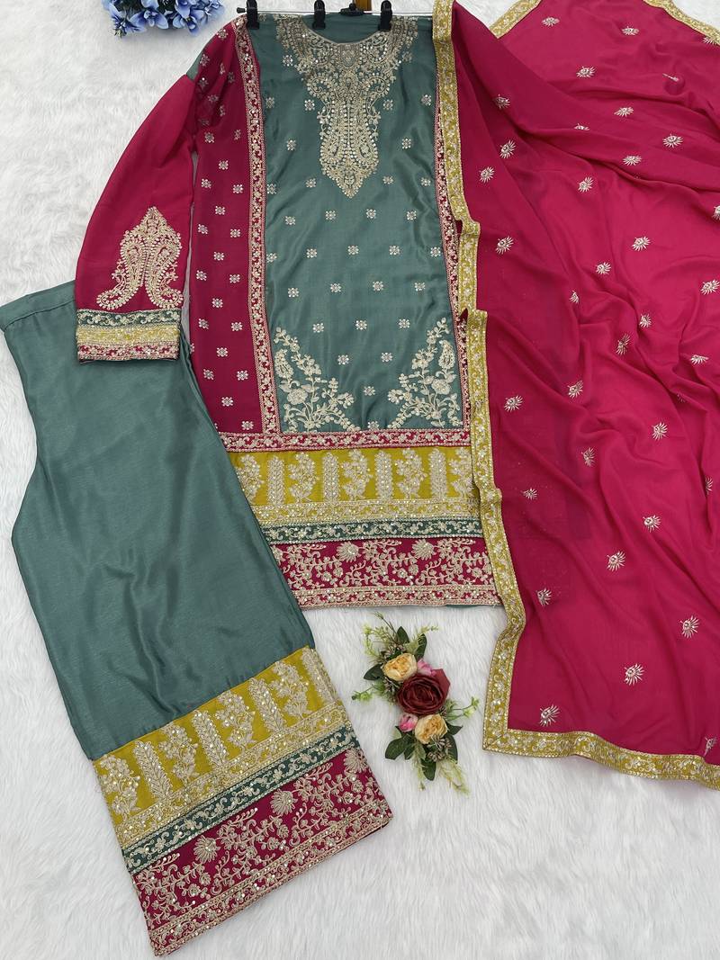 Sea green chinon semi stitched suit with embroidery codding sequence work