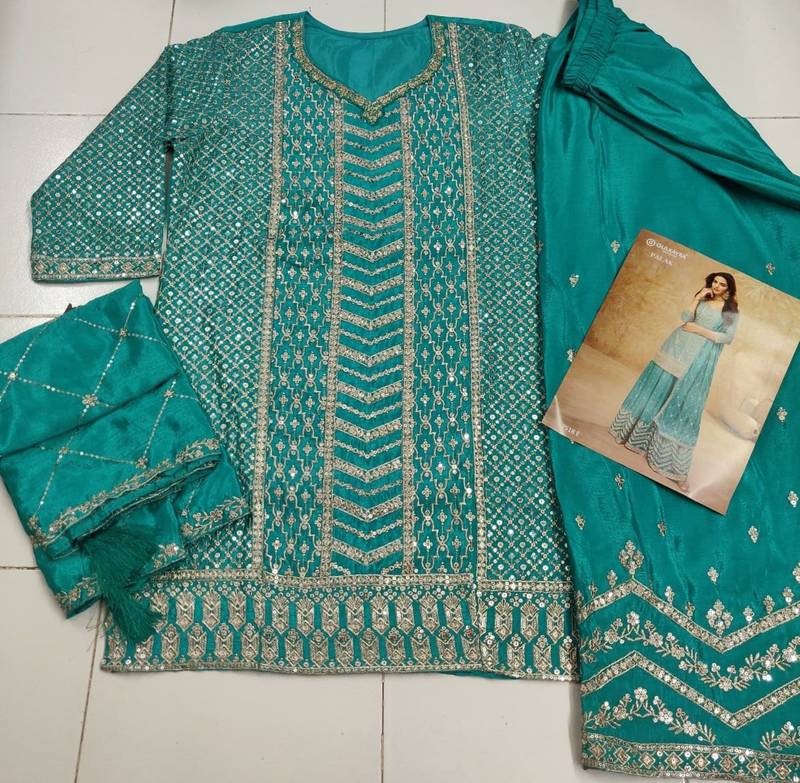 | Product Name | Sky Blue Chinon Sequin Embroidered Readymade Salwar Suit (Free Size) | |