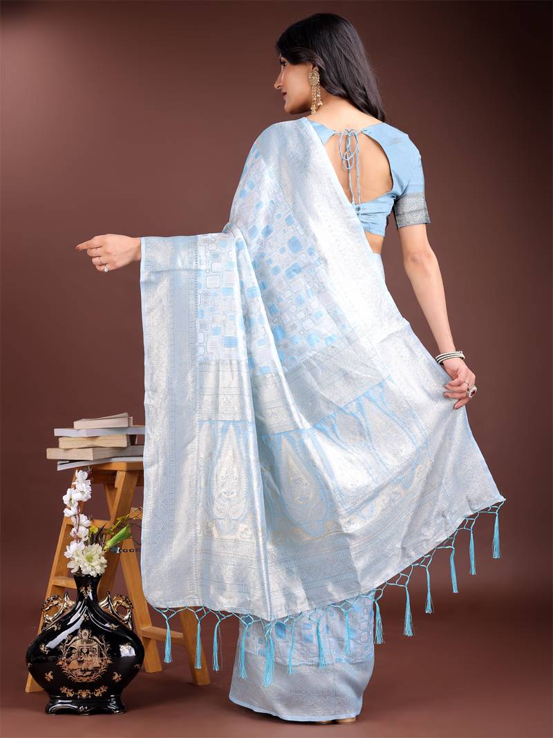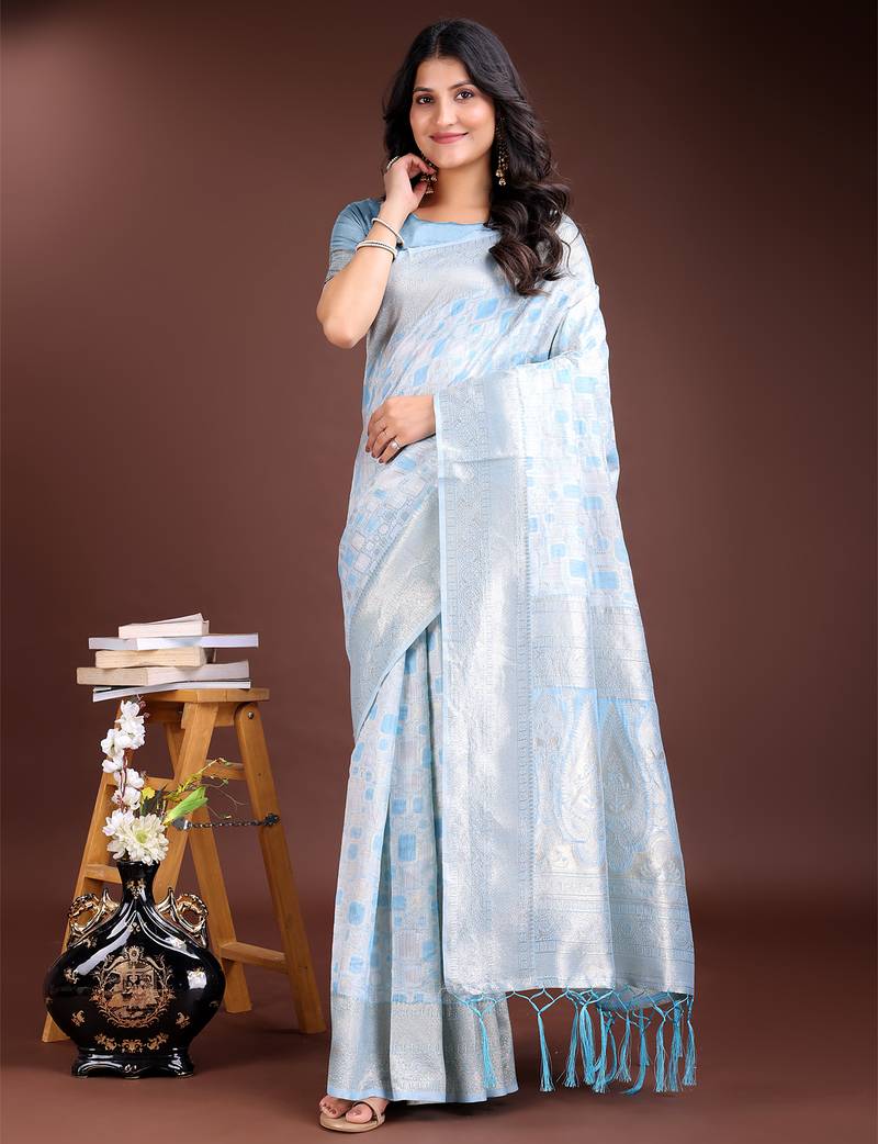 | Product Name | Sky Blue Linen Cotton With Printed And Zari Weaving Saree With Blouse | |